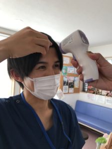 ・入口での手指消毒、非接触型の体温計で患者様の検温実施